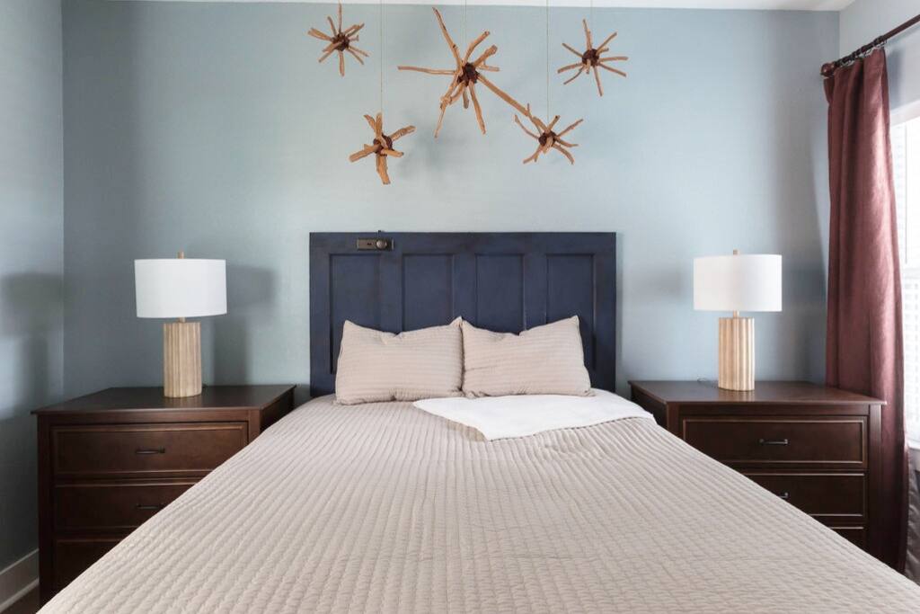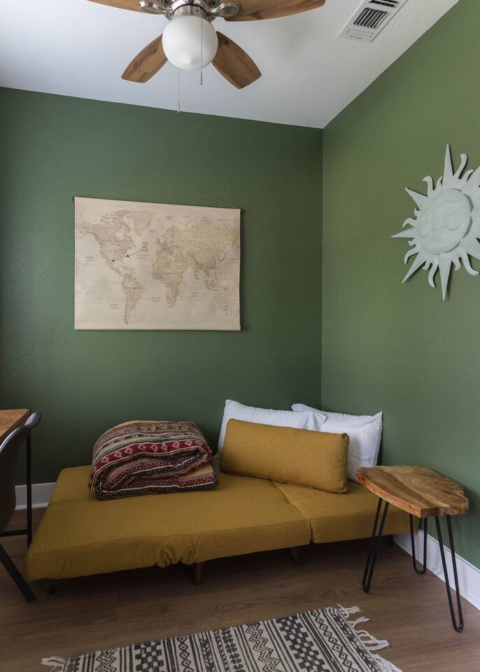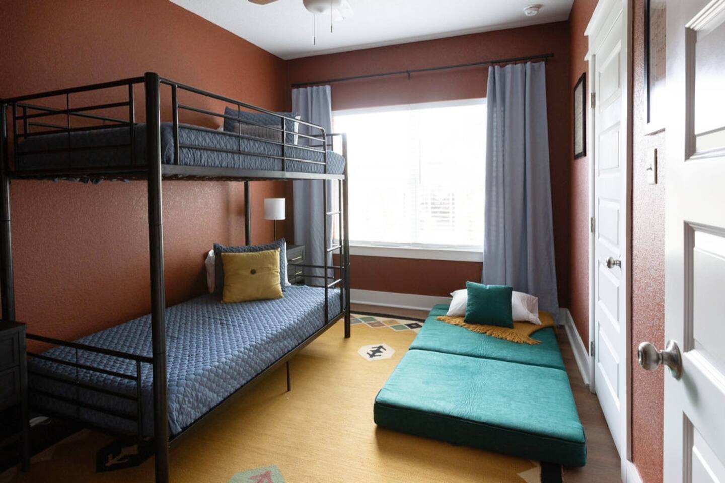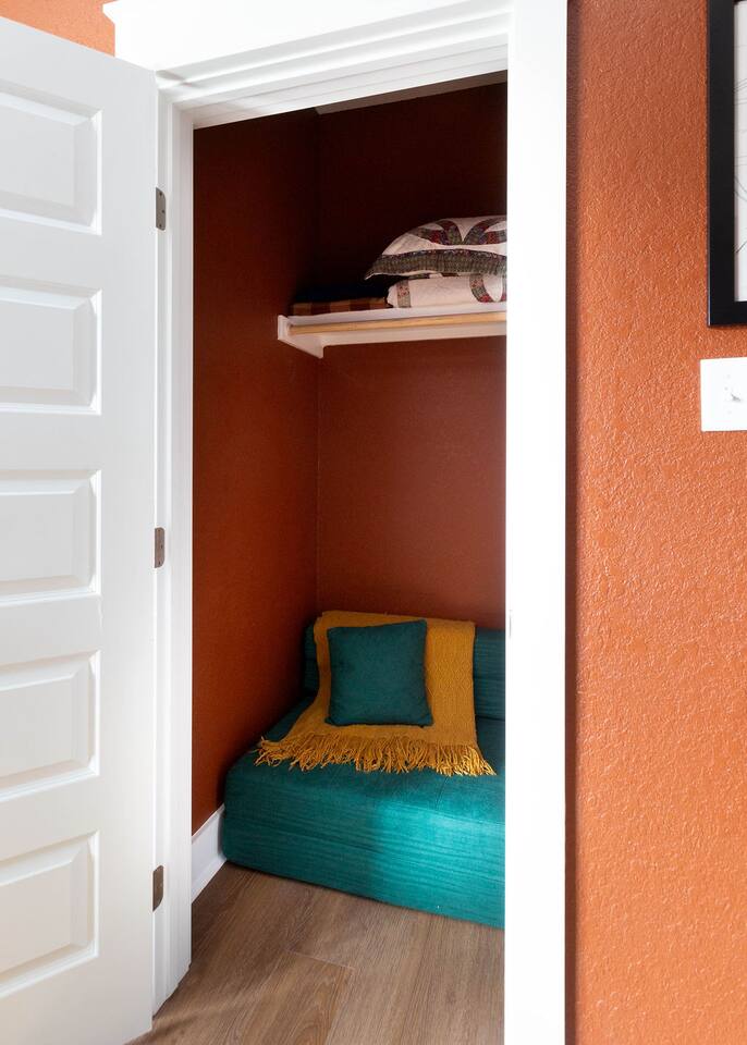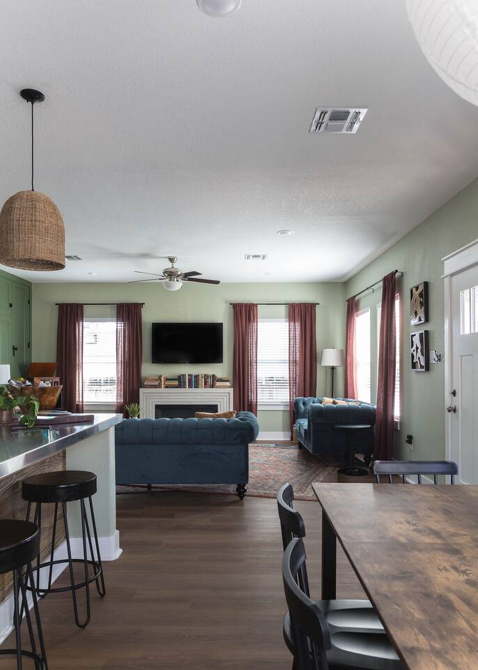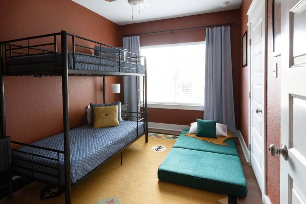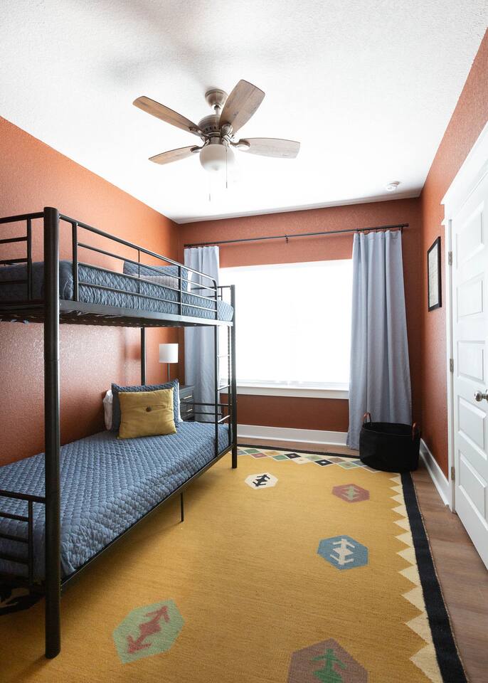 This is a newly rebuilt single story home with three bedrooms, two bathrooms, a flex room and a laundry closet. The front of the house is an open concept between the kitchen, dining area, and living room. At the rear of the house, you'll find the bedrooms, bathrooms and a flex room. The flex room can be used as a dedicated office space or a sleeping area. Sleeping Arrangements: · Primary Bedroom - King-sized bed with memory foam mattress · Bunk Room - Twin over twin bunk bed with memory foam mattresses. There is also a fold out chair stored in the closet that doubles as a twin mattress (see photos). This can be set up in the bunk room or the living room. Although the fold out chair can fit an adult, it's likely more comfortable for children and teenagers. · Queen Room - Queen-sized bed with memory foam mattress. · Flex Room - The mustard colored futon can be converted into a twin-sized bed. Although the futon can fit an adult, it's likely more comfortable for children and teenagers. · Pack & Play - Can be set up comfortably in any of the sleeping areas as needed. Sheets & waterproof mattress protector provided. Notes: · Black-out curtains and sound machines are provided in all sleeping areas to provide for uninterrupted sleep. · We think the perfect sized group for this space is up to 6 people. The full 8 can easily be accommodated, but just keep in mind that it will be a bit cozier.