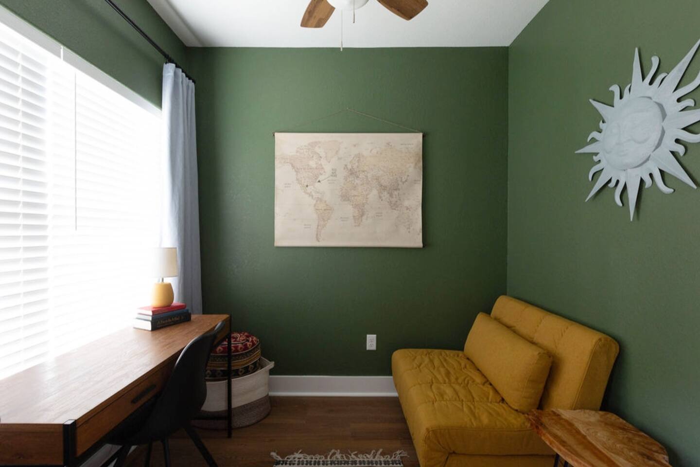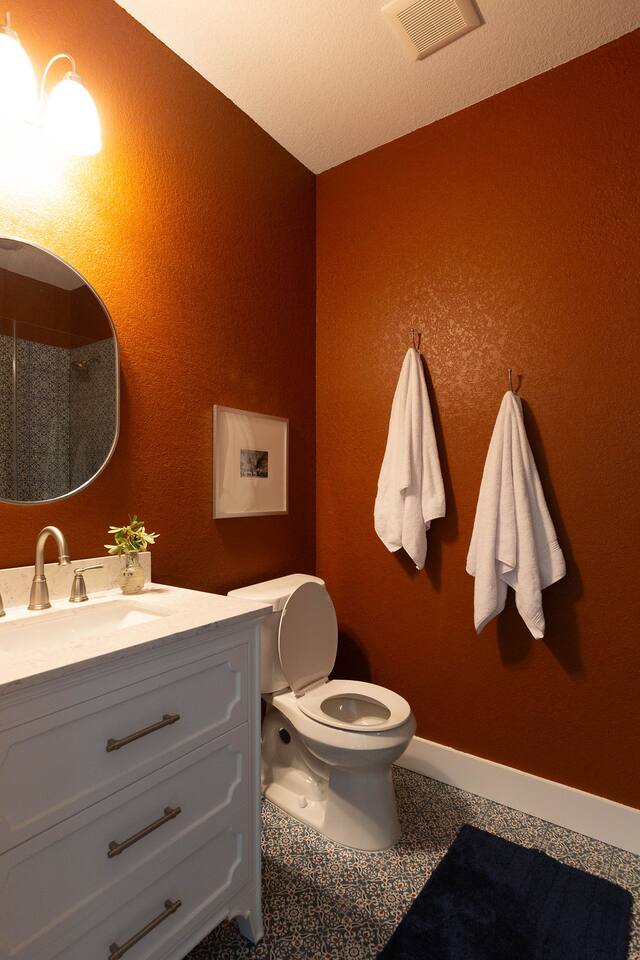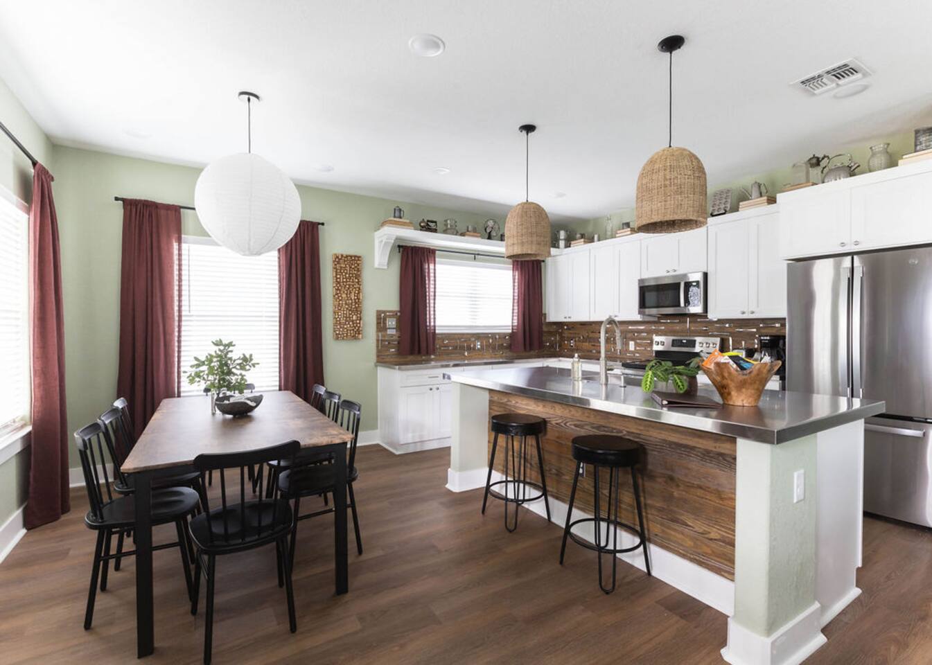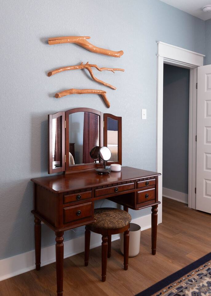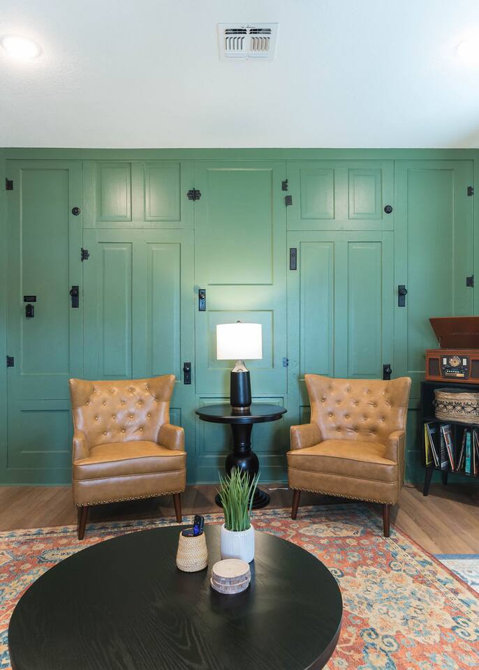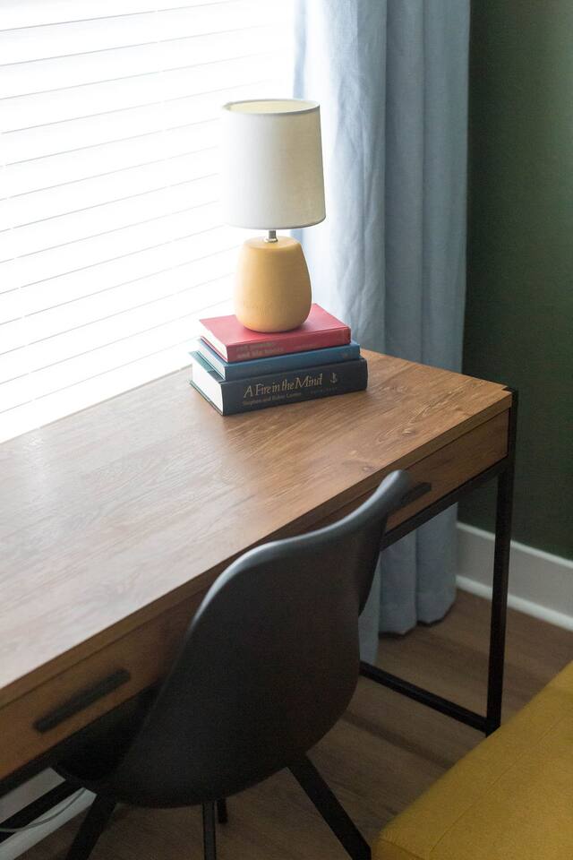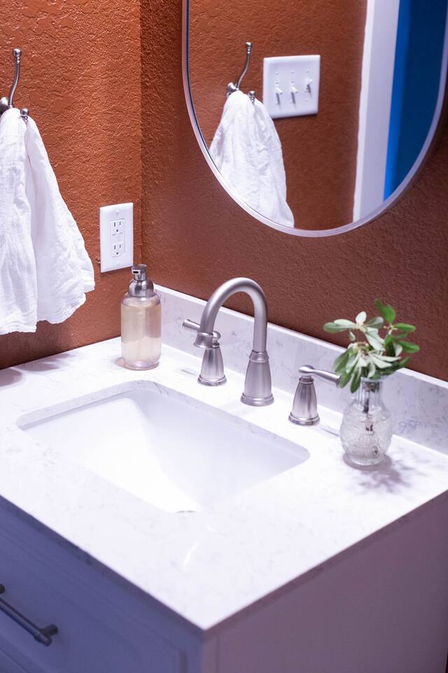 This is a newly rebuilt single story home with three bedrooms, two bathrooms, a flex room and a laundry closet. The front of the house is an open concept between the kitchen, dining area, and living room. At the rear of the house, you'll find the bedrooms, bathrooms and a flex room. The flex room can be used as a dedicated office space or a sleeping area. Sleeping Arrangements: · Primary Bedroom - King-sized bed with memory foam mattress · Bunk Room - Twin over twin bunk bed with memory foam mattresses. There is also a fold out chair stored in the closet that doubles as a twin mattress (see photos). This can be set up in the bunk room or the living room. Although the fold out chair can fit an adult, it's likely more comfortable for children and teenagers. · Queen Room - Queen-sized bed with memory foam mattress. · Flex Room - The mustard colored futon can be converted into a twin-sized bed. Although the futon can fit an adult, it's likely more comfortable for children and teenagers. · Pack & Play - Can be set up comfortably in any of the sleeping areas as needed. Sheets & waterproof mattress protector provided. Notes: · Black-out curtains and sound machines are provided in all sleeping areas to provide for uninterrupted sleep. · We think the perfect sized group for this space is up to 6 people. The full 8 can easily be accommodated, but just keep in mind that it will be a bit cozier.