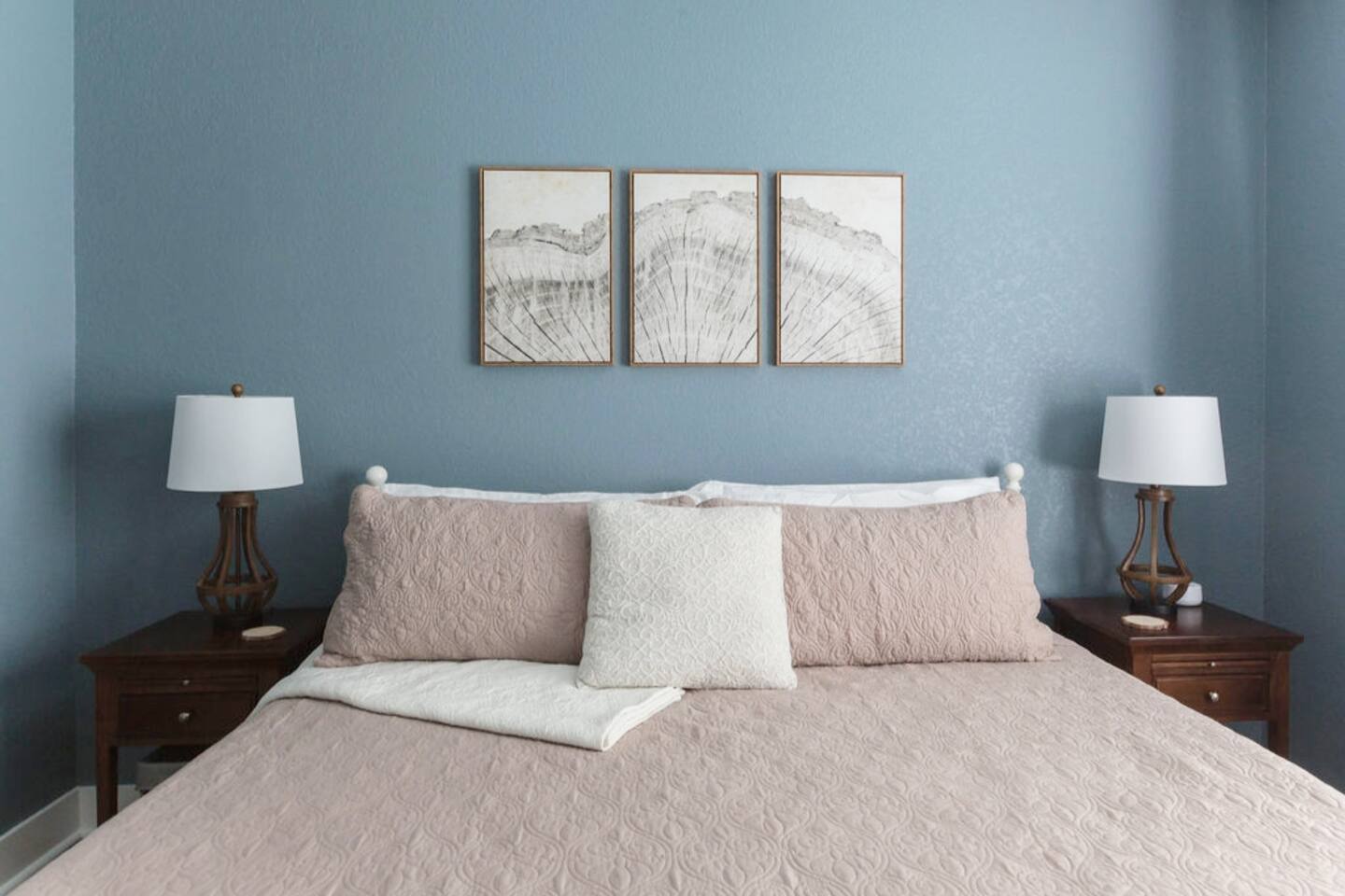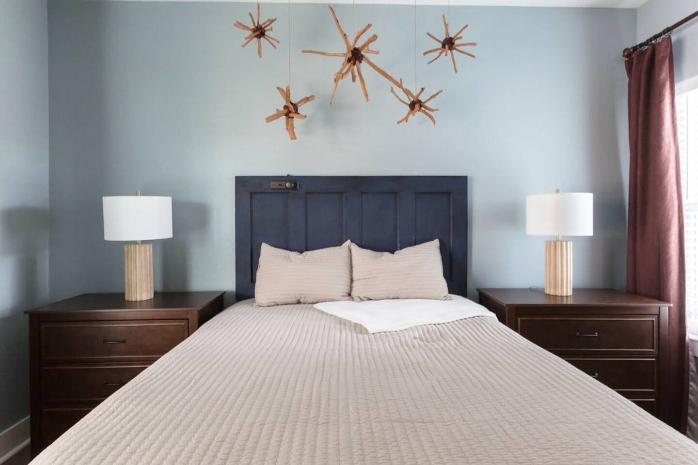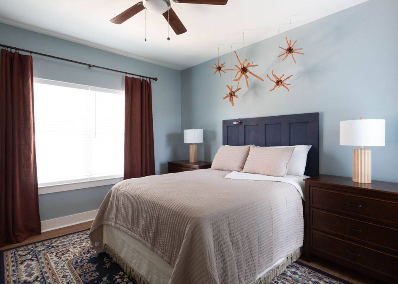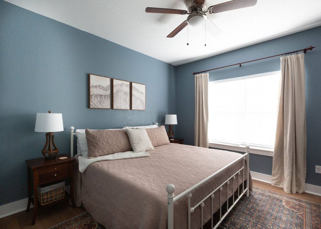 This is a newly rebuilt single story home with three bedrooms, two bathrooms, a flex room and a laundry closet. The front of the house is an open concept between the kitchen, dining area, and living room. At the rear of the house, you'll find the bedrooms, bathrooms and a flex room. The flex room can be used as a dedicated office space or a sleeping area. Sleeping Arrangements: · Primary Bedroom - King-sized bed with memory foam mattress · Bunk Room - Twin over twin bunk bed with memory foam mattresses. There is also a fold out chair stored in the closet that doubles as a twin mattress (see photos). This can be set up in the bunk room or the living room. Although the fold out chair can fit an adult, it's likely more comfortable for children and teenagers. · Queen Room - Queen-sized bed with memory foam mattress. · Flex Room - The mustard colored futon can be converted into a twin-sized bed. Although the futon can fit an adult, it's likely more comfortable for children and teenagers. · Pack & Play - Can be set up comfortably in any of the sleeping areas as needed. Sheets & waterproof mattress protector provided. Notes: · Black-out curtains and sound machines are provided in all sleeping areas to provide for uninterrupted sleep. · We think the perfect sized group for this space is up to 6 people. The full 8 can easily be accommodated, but just keep in mind that it will be a bit cozier.