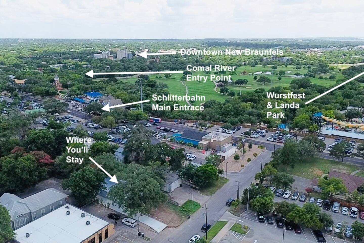 Helpful Walking/Driving Distances: To Schlitterbahn Main Entrance - 4 minute walk (you can see the park from the end of the driveway) To Comal River Tube Chute - 16 minute walk/ 4 minute drive To Downtown Plaza - 23 minute walk/ 3 minute drive To Gruene - 7 minute drive To Wurstfest Entrance - 18 minute walk / 3 minute drive To Landa Park Golf Course - 5 minute drive To Whitewater Amphitheater - 20 minute drive To San Antonio International Airport - 41 minute drive To Austin Bergstrom International Airport - 1 hour drive